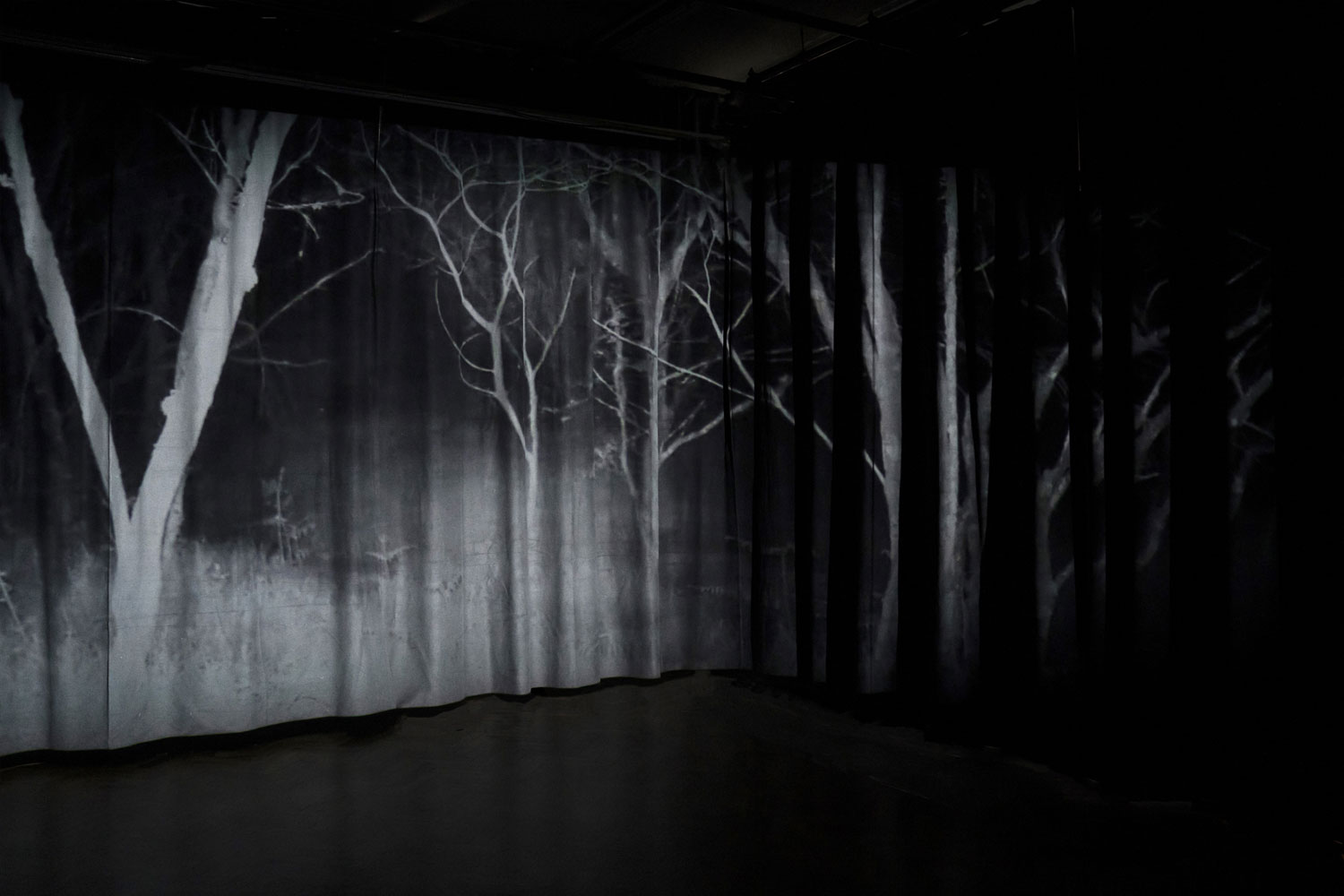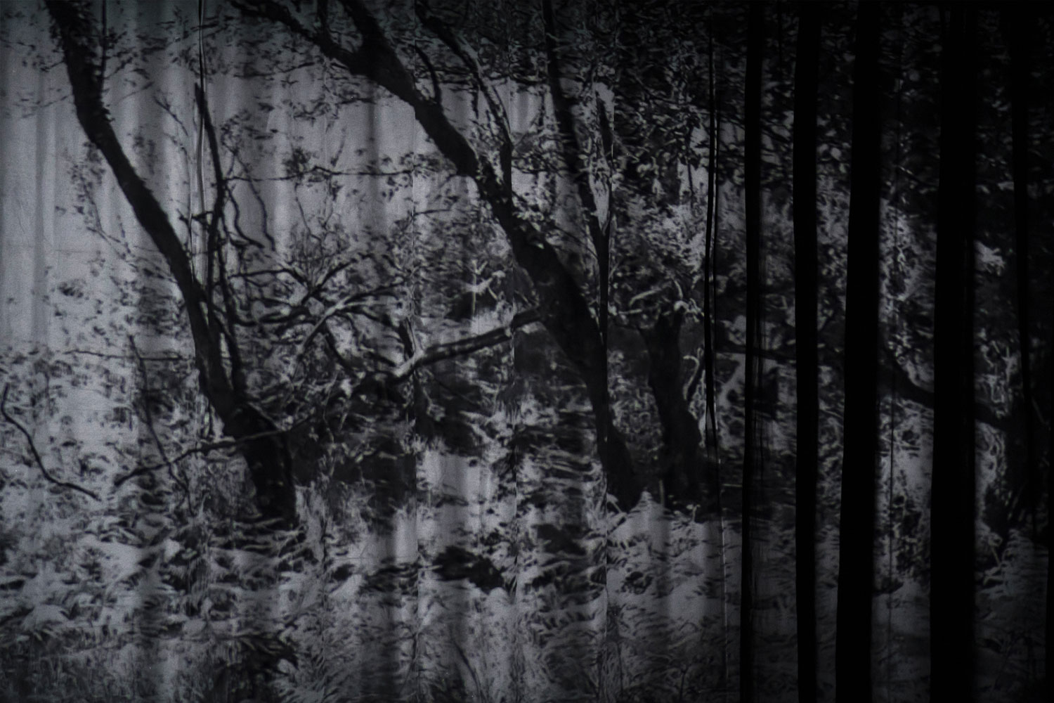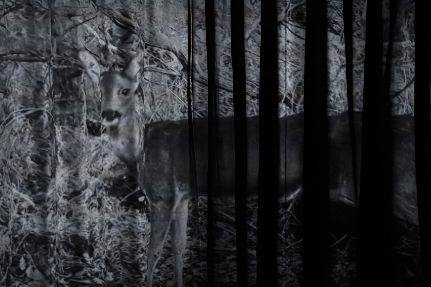 eye sleeps, ear breathes is a mixed media installation based on field recordings of animal habitats, transposed in a multichannel sound composition (23') that puts the visitor in a state of uncertainty, provoking tension in the auditory apparatus and altering the listening and auditory perception.