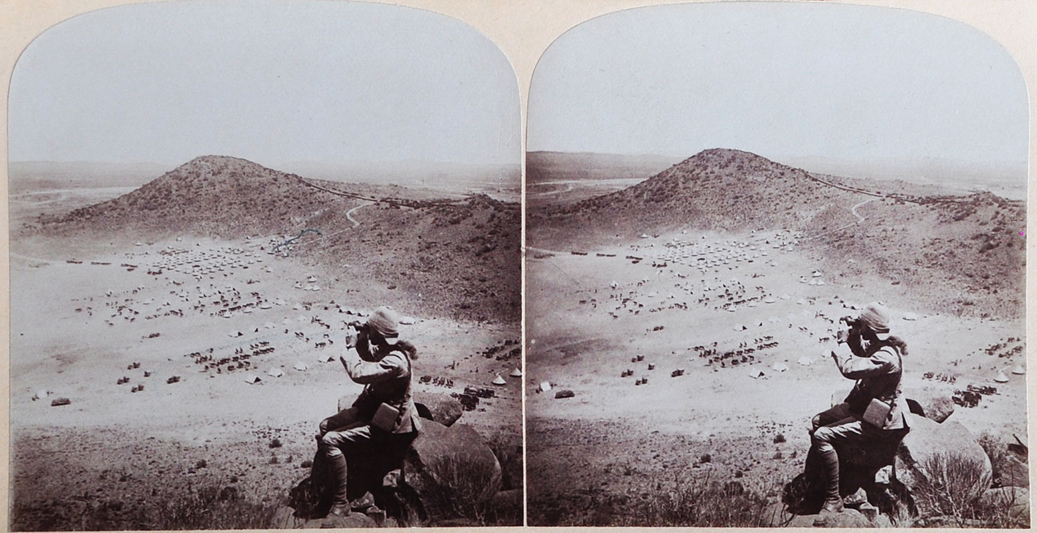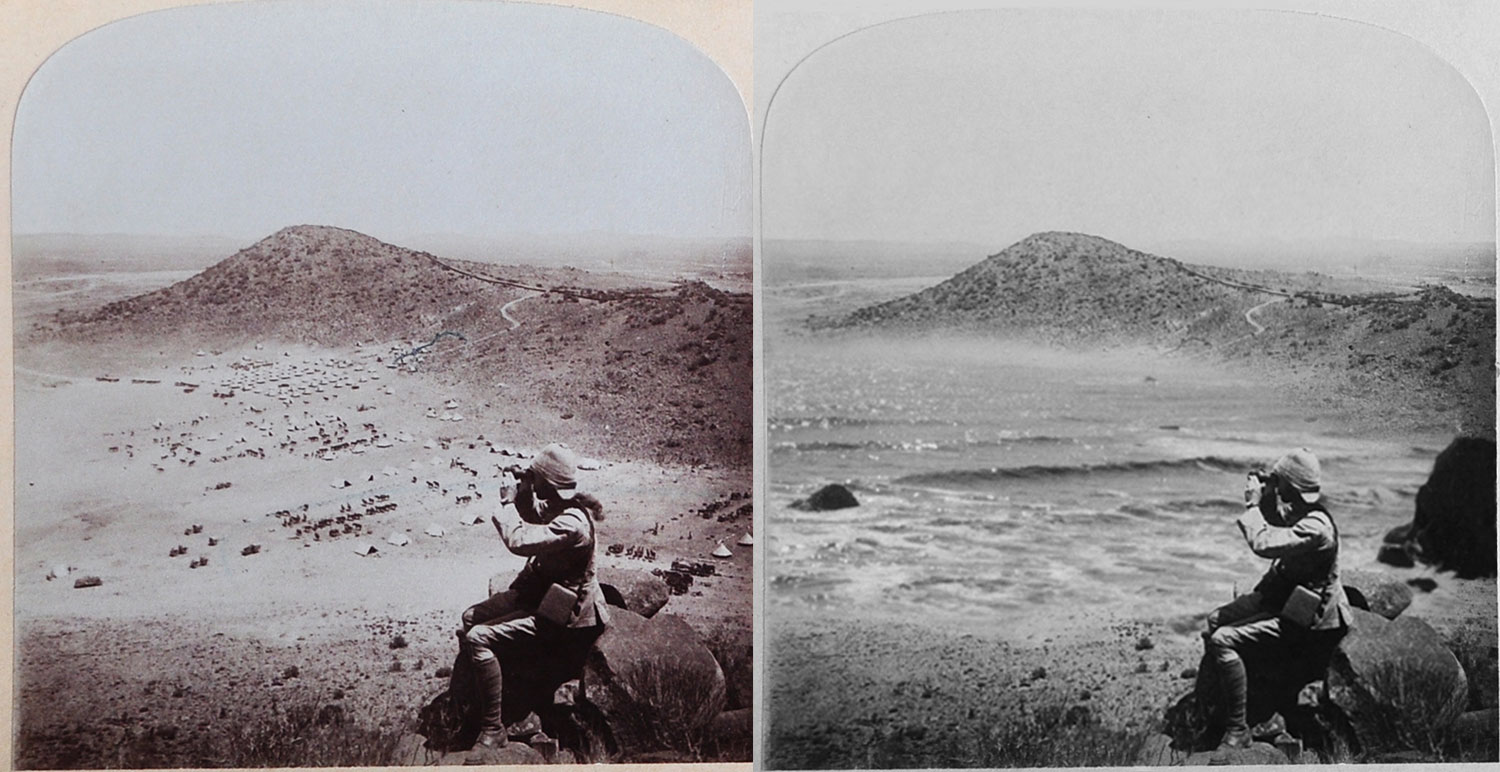 The work is based on a stereoscopic found image and her digitally and poetically altered state. The original image shows a military camp and a human figure observing the soldiers from a hill. This reconnaissance position is given to the visitor: a look through the stereoscope offers completely different vision of the photograph. The military camp is now covered with water. In place of soldiers, there is only the ocean.