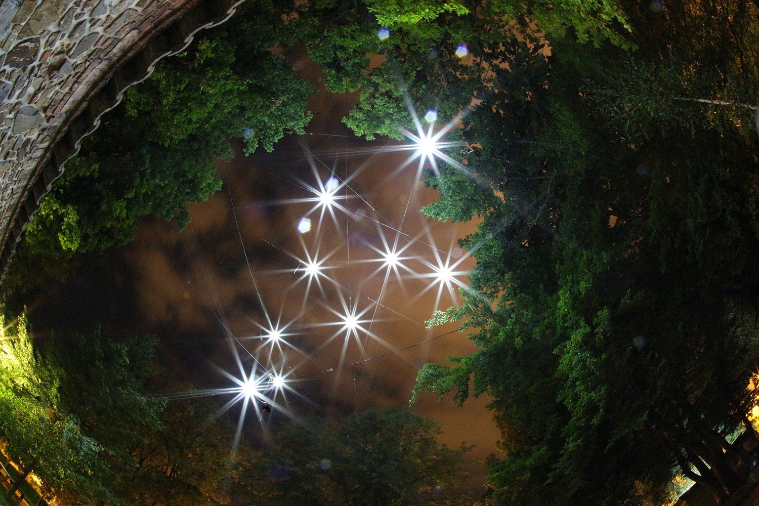 A simulation of a constellation in Križanke park during Svetlobna Gverila Festival (Ljubljana) was created, visible in the night sky among the tree canopies. The movement of the light elements is slow and in shorter time intervals barely noticeable, but their position is different every day due to their incessant movement.