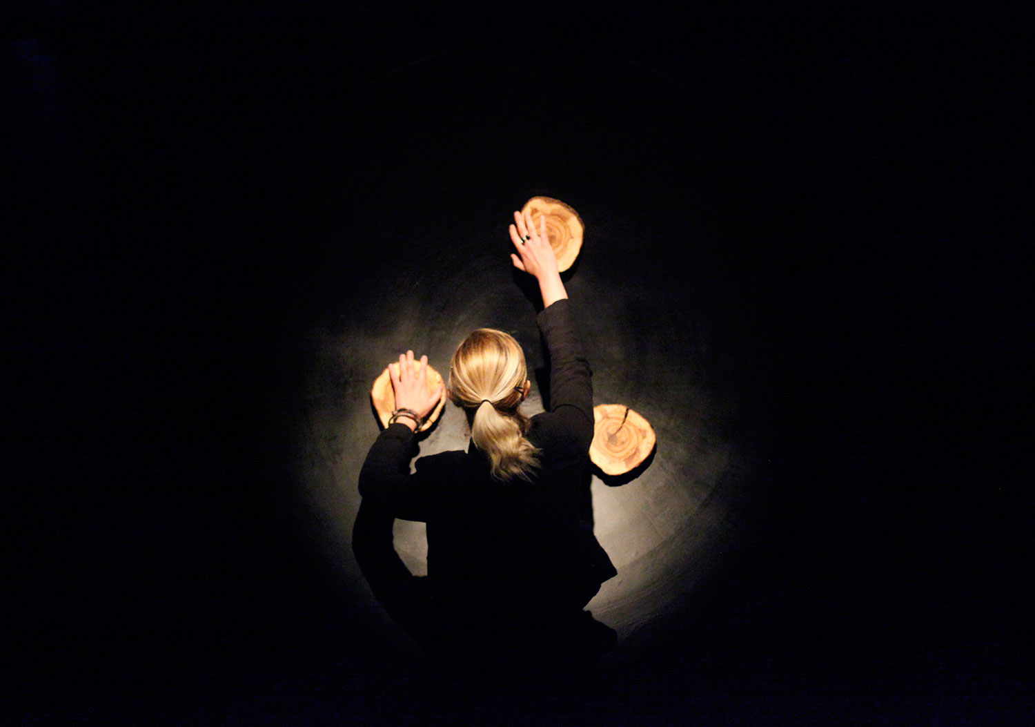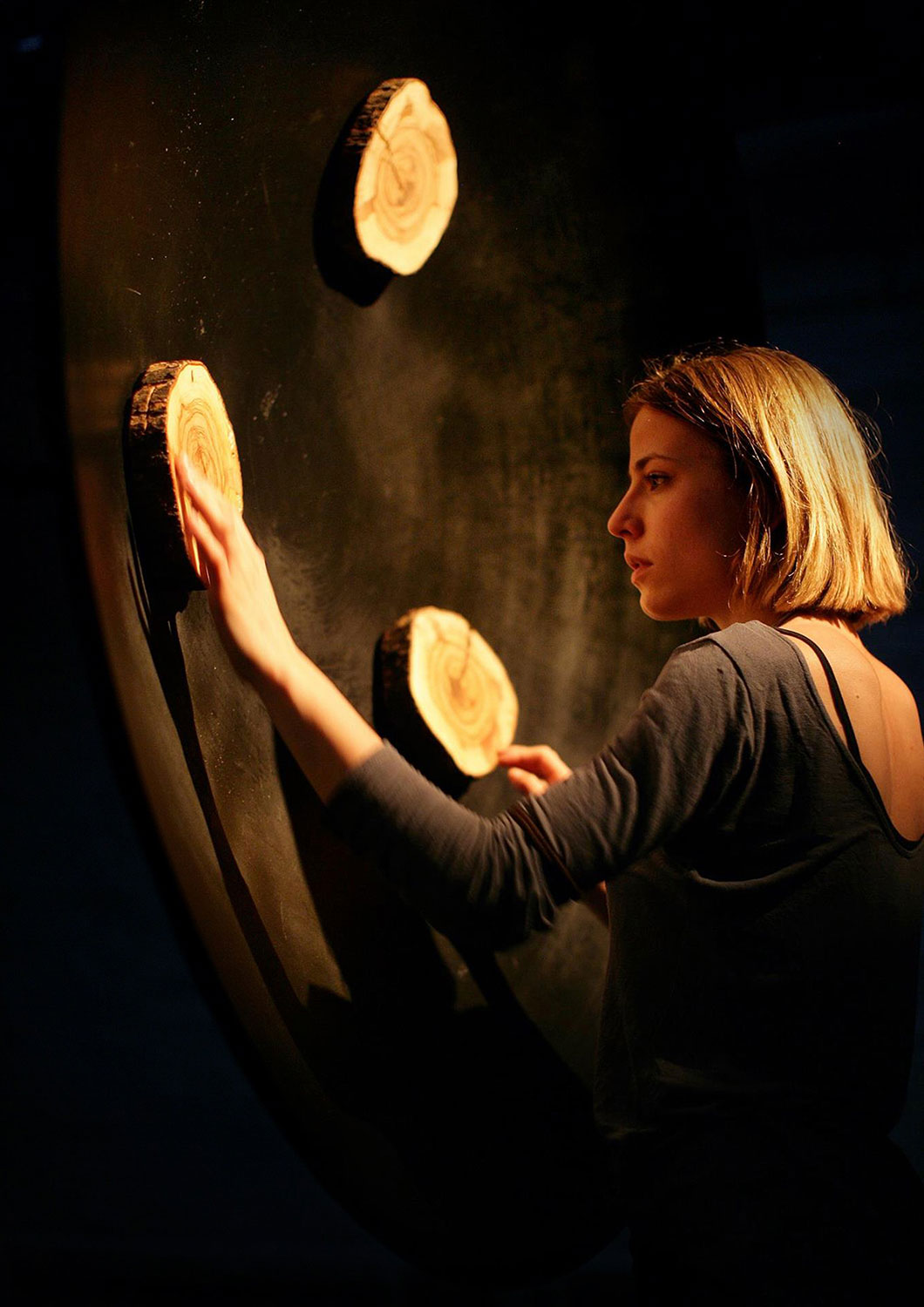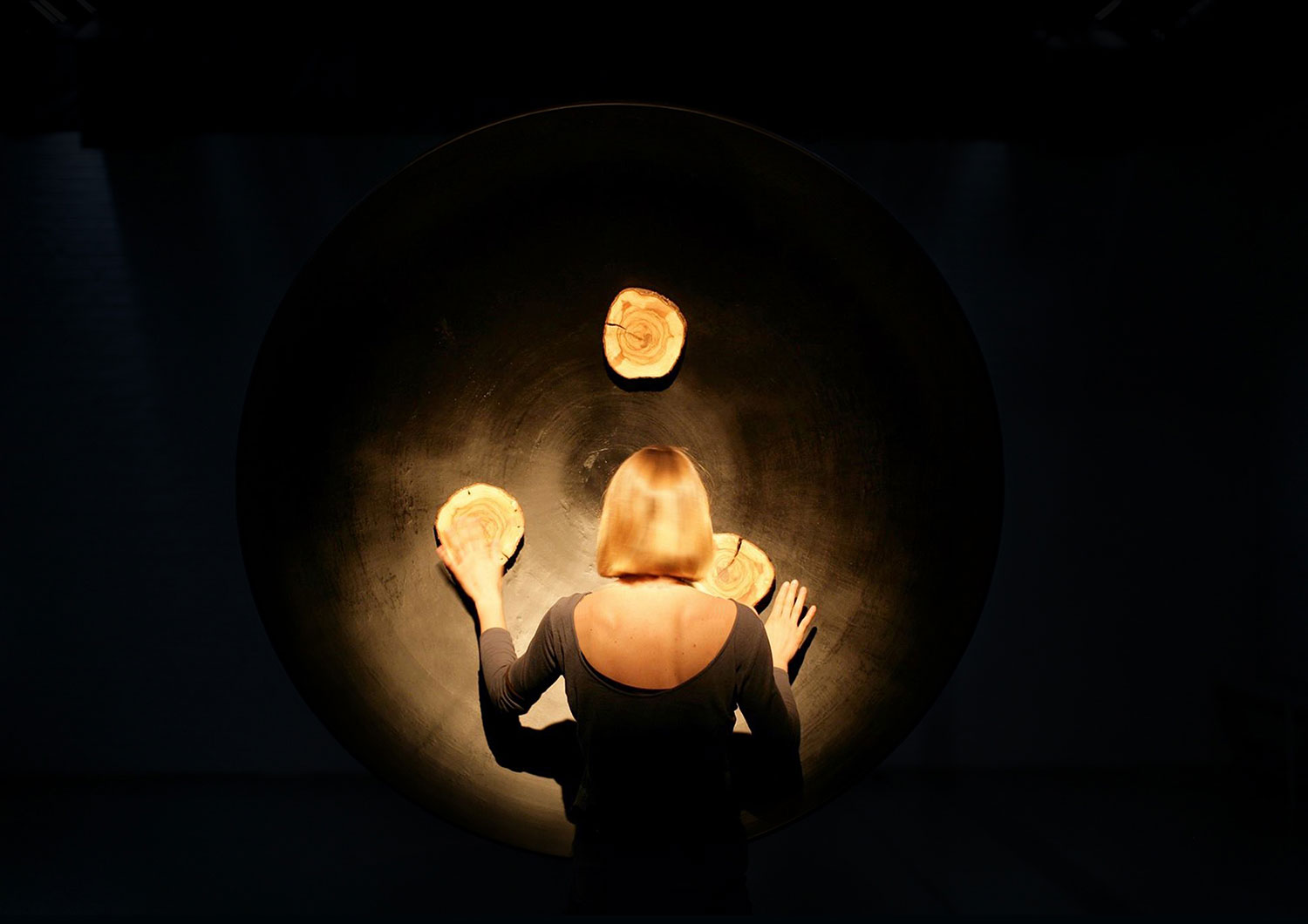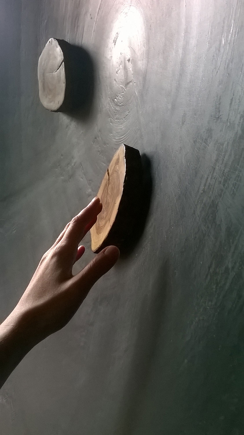 The work consists of a trunk of an old Istrian olive tree, brought down by the forces of nature. Every growth ring is a witness of time and a pledge of a new journey. The gallery space is filled with emptiness. The silence draws us in. The visitor is invited to gently touch the time of the tree and activate the sounds, noises and harmonies of the music which nature inscribed among the growth rings (wind, rain and waves) in subtle combination with the NASA's sound probes waves recorded in Space (stars explosions, whispers).