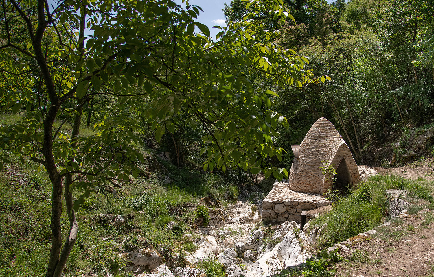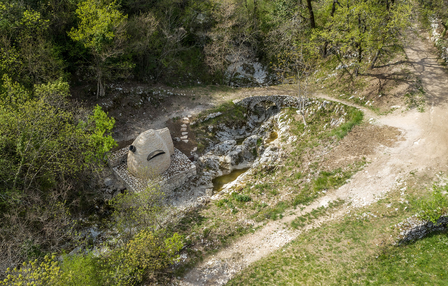 Water has always played an important role in the lives of the residents of Lovranska Draga, and has drawn a living network of roads, paths and bridges into its land. "Puli Mȁlina", an object inspired by traditional field shelters, is located on one such path - on the found remains of an old mill. The concept of a sculptural object in the landscape is based on the idea of creating a space that would become a meeting place and a place to rest, as well as a place to learn about the specifics of this region.