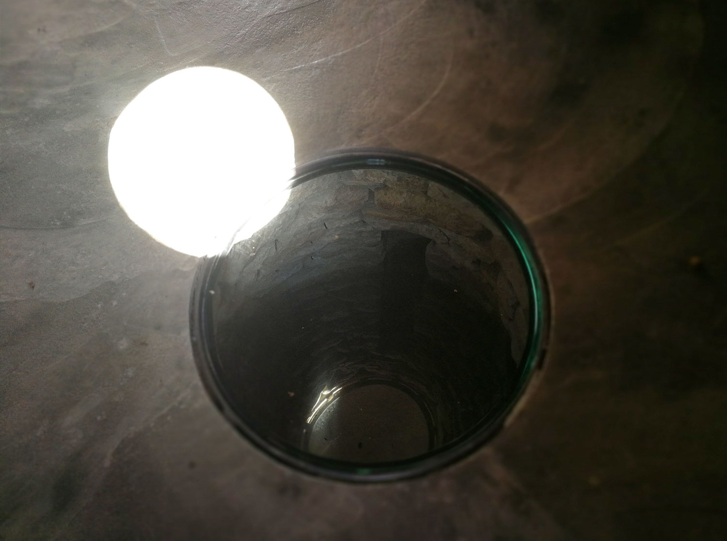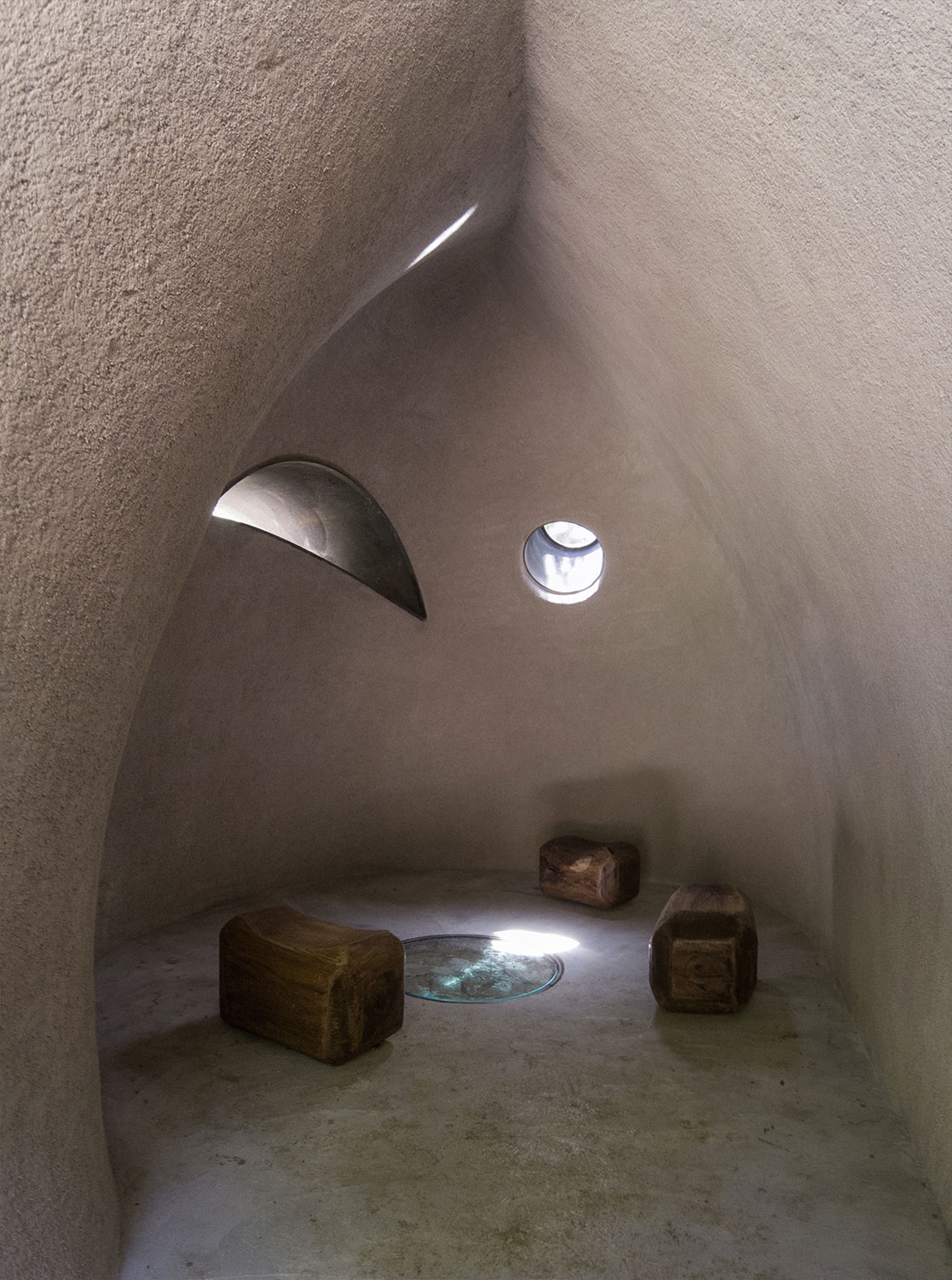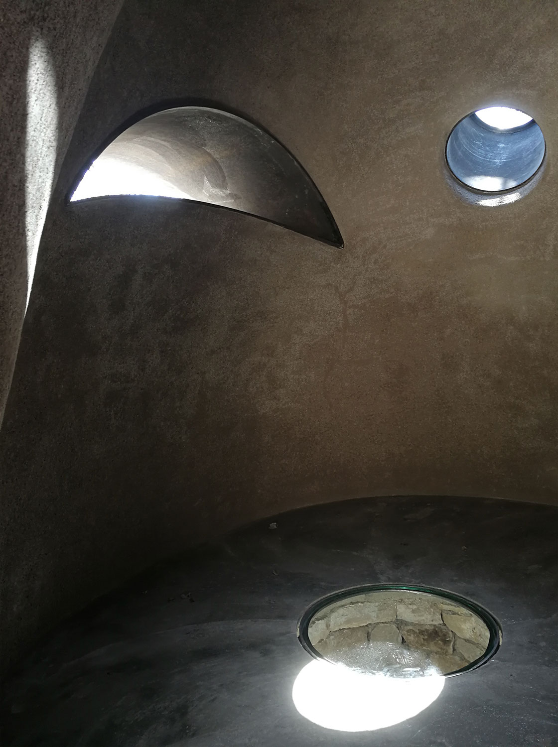 The particularity of the location gives an important role to the object's orientation towards sunlight. The view from the interior extends through the eastern window towards the mountain silhouette. This opening/window is conceived as an arc of the path of sunlight, which follows and marks the first sunrises of the sun at the time of the summer and winter solstice. In the center of the object there is a circular tempered glass. Spring water flows under that glass, only when there is water in the main stream. The bottom of the "flow well" is made of reflective metal in order to allow light rays to touch in its refractive games through the water. In the pavilion, around the glass well, there are three small seats, škanjići, made and processed from local maroon chestnut wood. Their positions provide space for lodging. There is a circular window on the south side. Its position is placed so that on the first day of spring and autumn (spring and autumn equinox) it allows the sun's rays to touch the bottom of the well (specifically at that location before the earth's rotation and the crowns of the surrounding trees block the light). Next to the pavilion, a forest garden has been planted, which contains almost all autochthonous plant species from the entire climate.