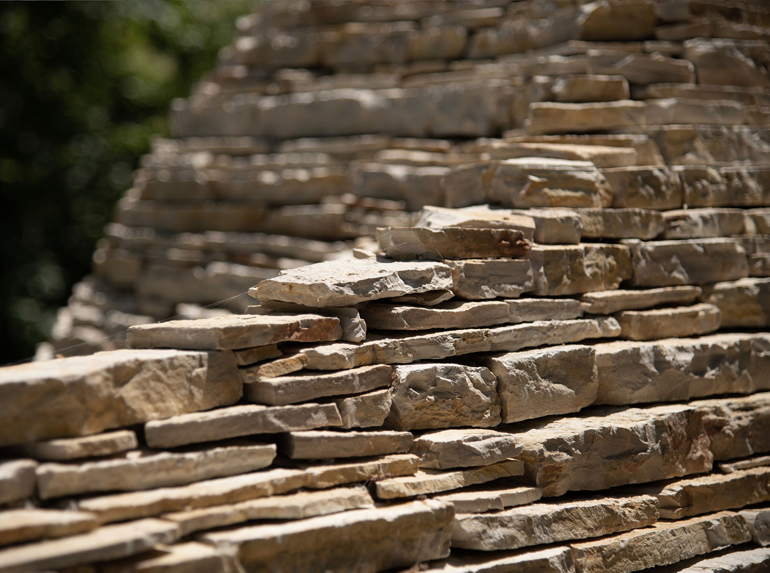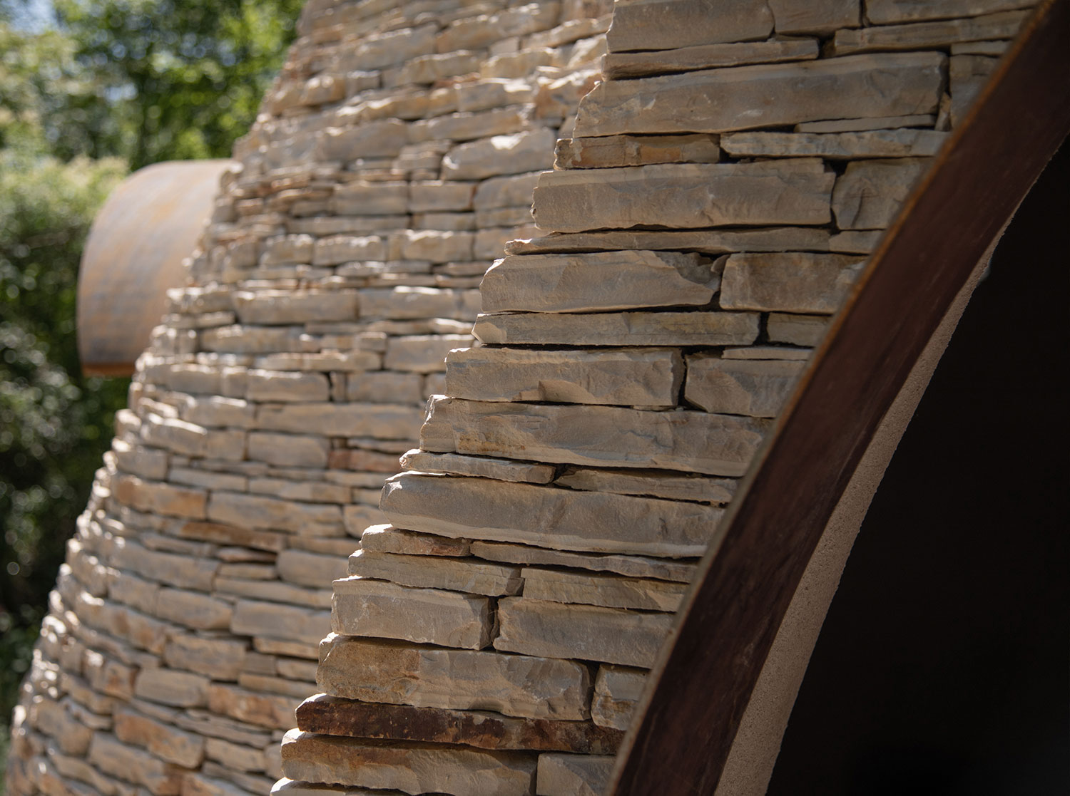 The materialization of the idea occurs with the construction of a stone pavilion that serves as a place of shelter and a place for perceptive phenomena of the play of light and its reflection together with water. The base of the pavilion was built from the stone remains of the old mill. Materials used in construction are local maroon chestnut (seats), stone, corten, glass, stainless steel. The interior of the walls is plastered with lime plaster with the addition of natural pigment.